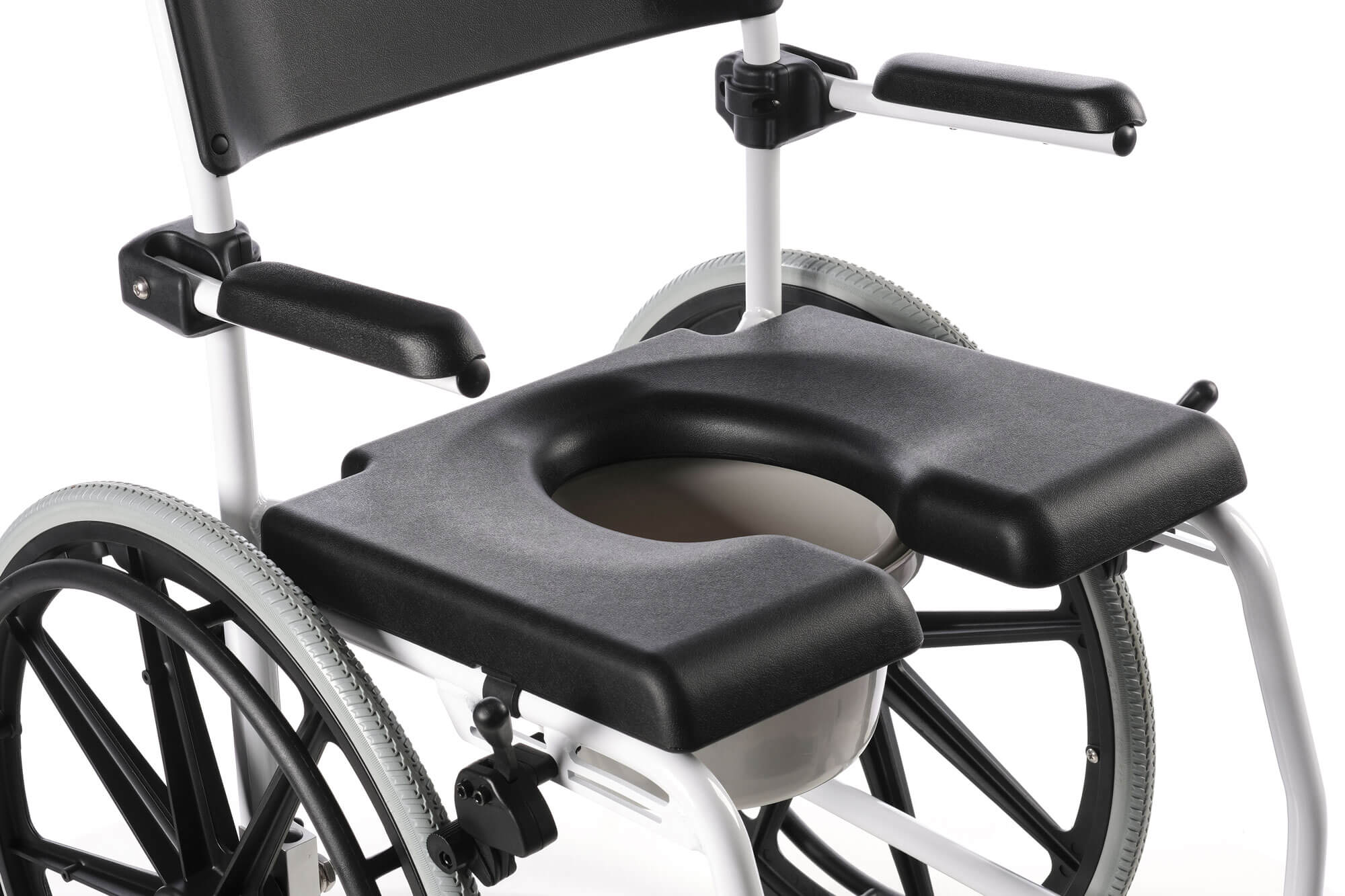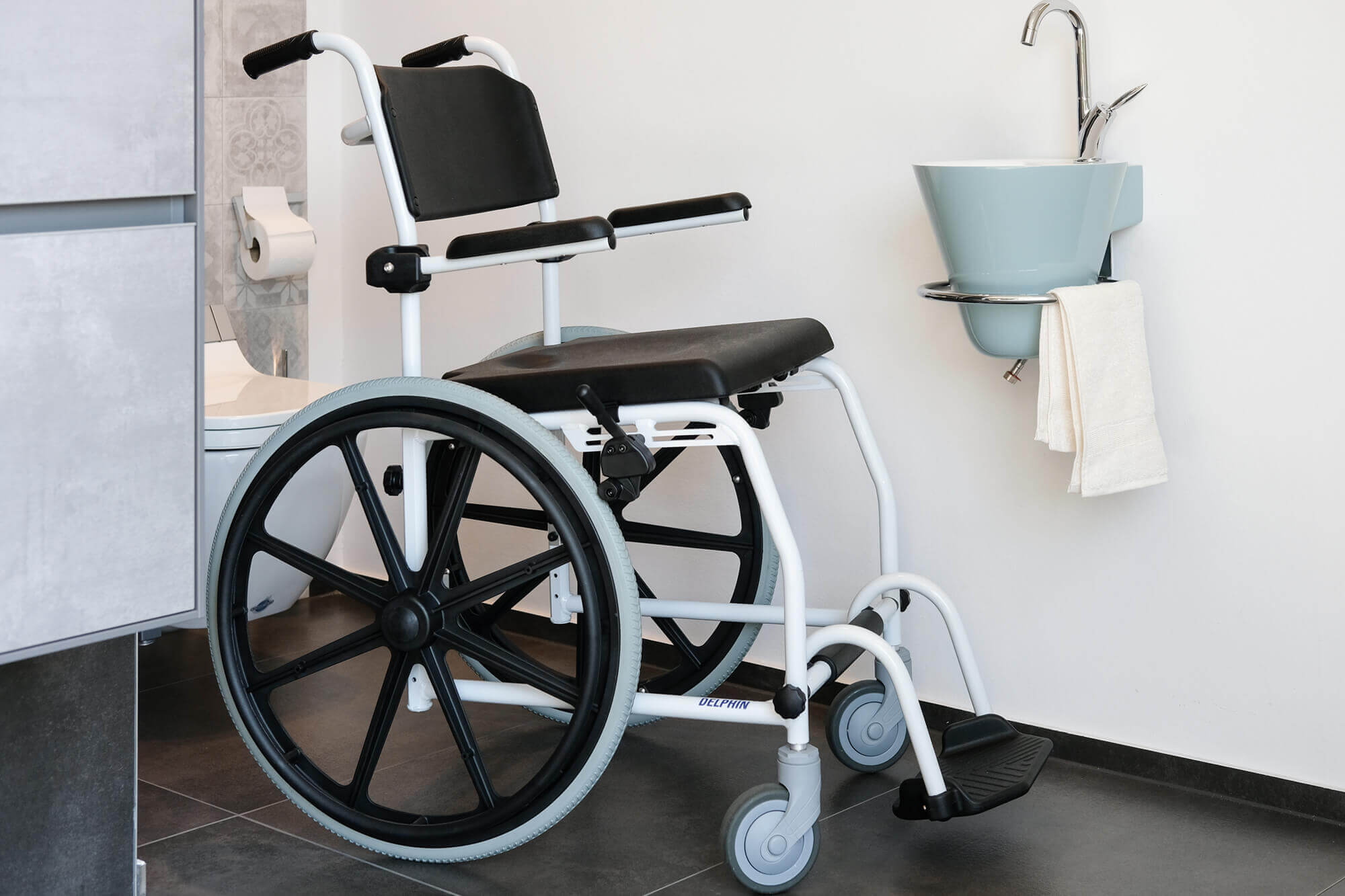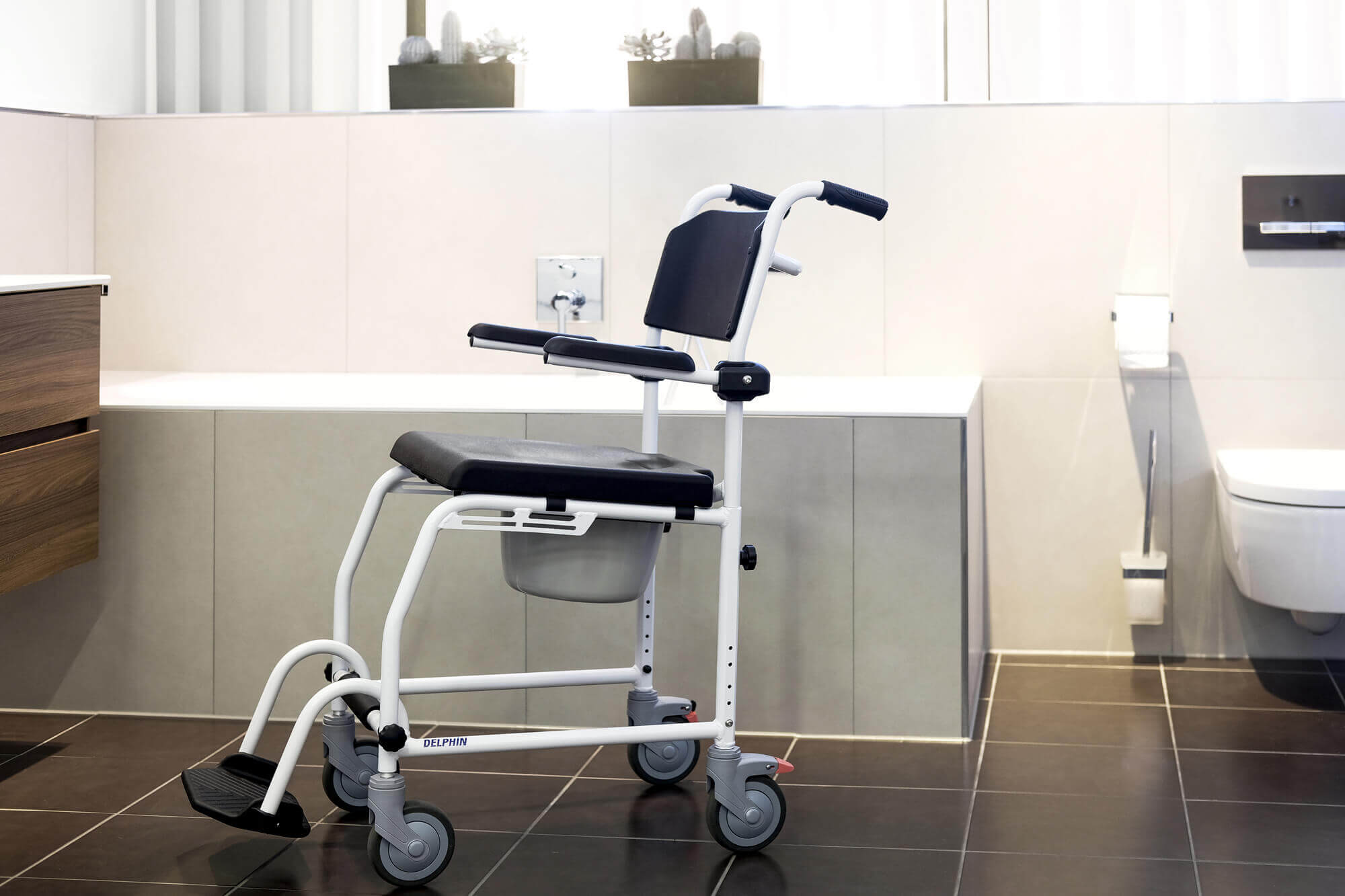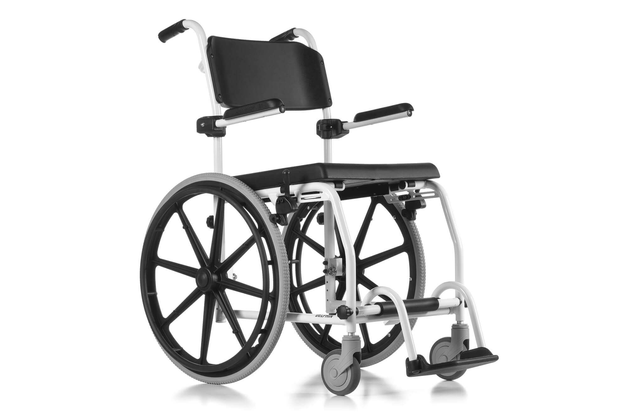 Le fauteuil Delphin est très bien adapté aux utilisateurs qui sont autonomes dans la vie quotidienne. Le fauteuil roulant Delphin est l'unique solution pour la toilette et la douche. Conçu pour le bien-être des utilisateurs. Doté d'une assise percée, il peut être également positionné au dessus de cuvettes de WC. Dossier, assise et repose-pieds ont une forme ergonomiques. Des accoudoirs revelables pour assurer la liberté de mouvement. Toutes les parties en contact avec le corps sont fabriquées dans un matériau doux pour la peau pour un maximum de confort.