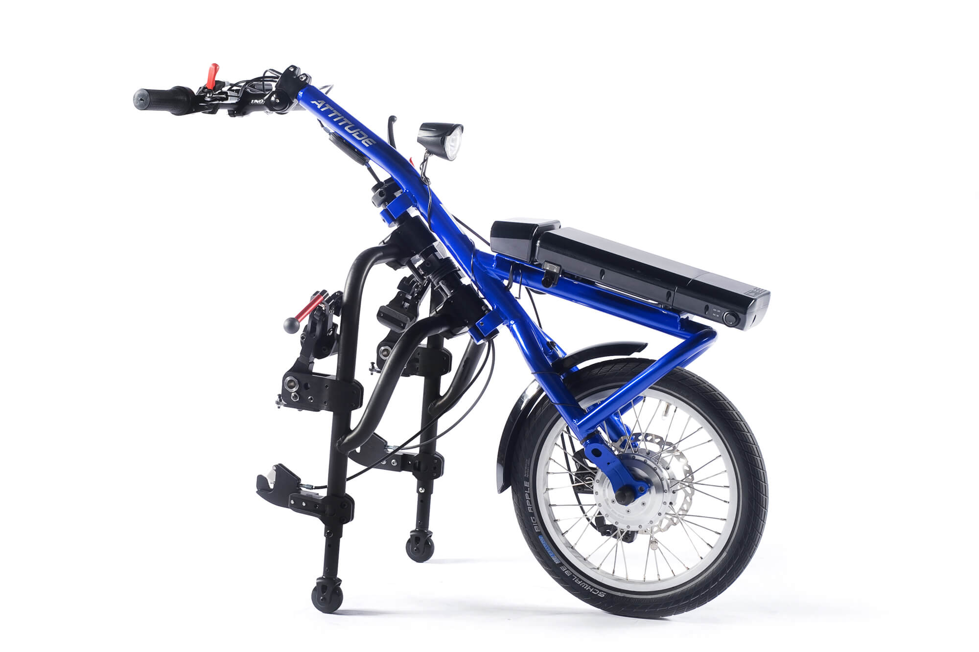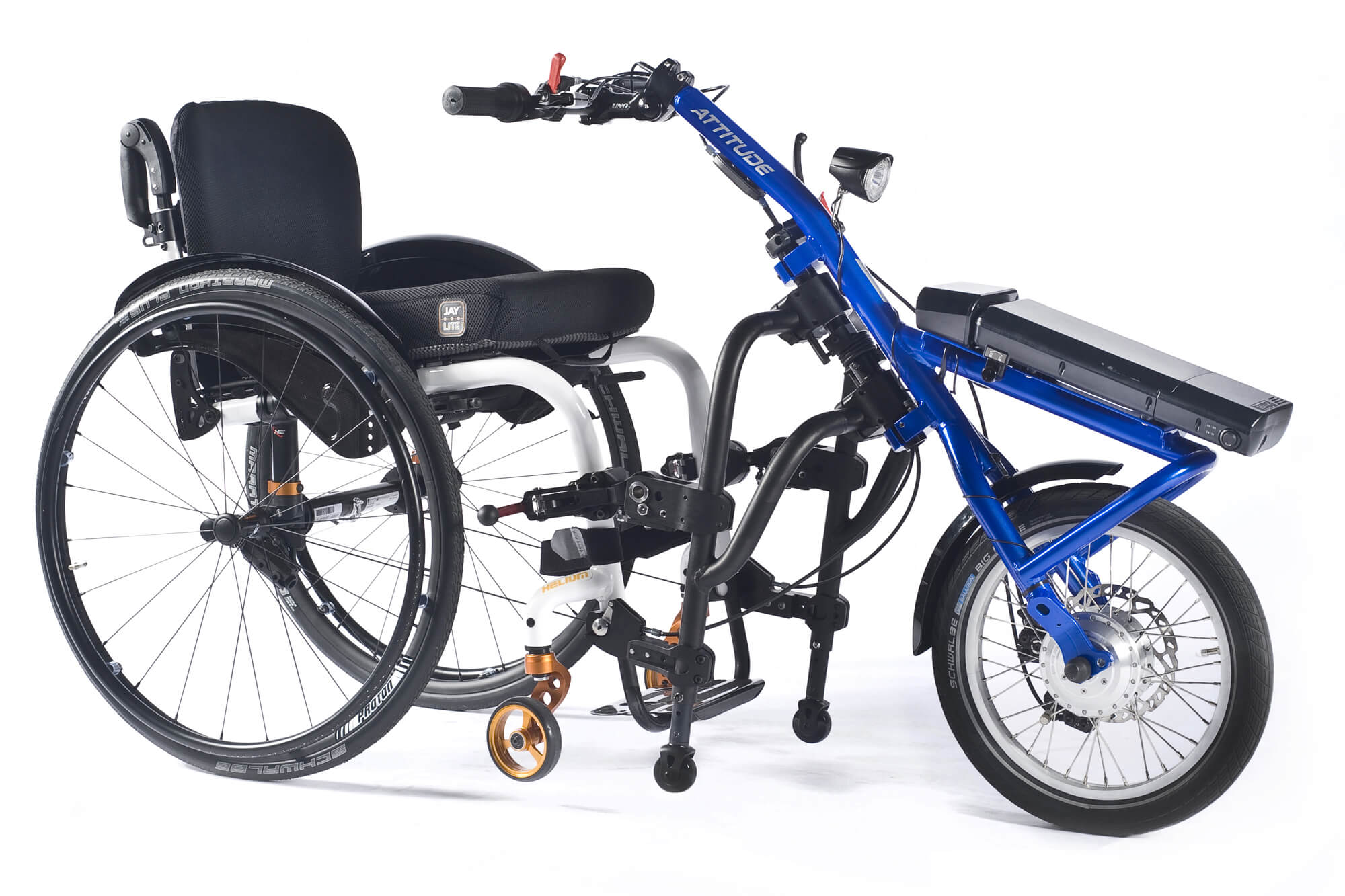 Parce que dans votre vie active vous n'avez pas de temps à perdre, les handbikes Attitude disposent d'un système d'ancrage ingénieux à 4 points qui permet de combiner le handbike au fauteuil roulant en quelques secondes .... et il se détache aussi rapidement... et vous continuez de profiter de la légèreté et des performances de votre fauteuil Empulse, avec seulement 2 axes additionnels sur l'avant de votre fauteuil!.